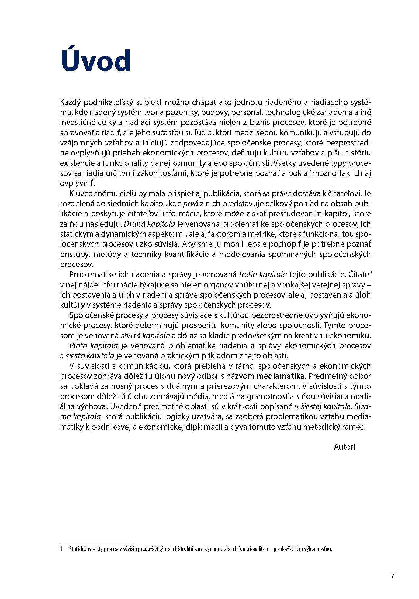 K uvedenému cieľu by mala prispieť aj publikácia, ktorá sa práve dostáva k čitateľovi. Je rozdelená do siedmich kapitol, kde prvá z nich predstavuje celkový pohľad na obsah publikácie a poskytuje čitateľovi informácie, ktoré môže získať preštudovaním kapitol, ktoré za ňou nasledujú. Druhá kapitola je venovaná problematike spoločenských procesov, ich statickým a dynamickým aspektom1, ale aj faktorom a metrike, ktoré s funkcionalitou spoločenských procesov úzko súvisia. Aby sme ju mohli lepšie pochopiť je potrebné poznať prístupy, metódy a techniky kvantifikácie a modelovania spomínaných spoločenských procesov.